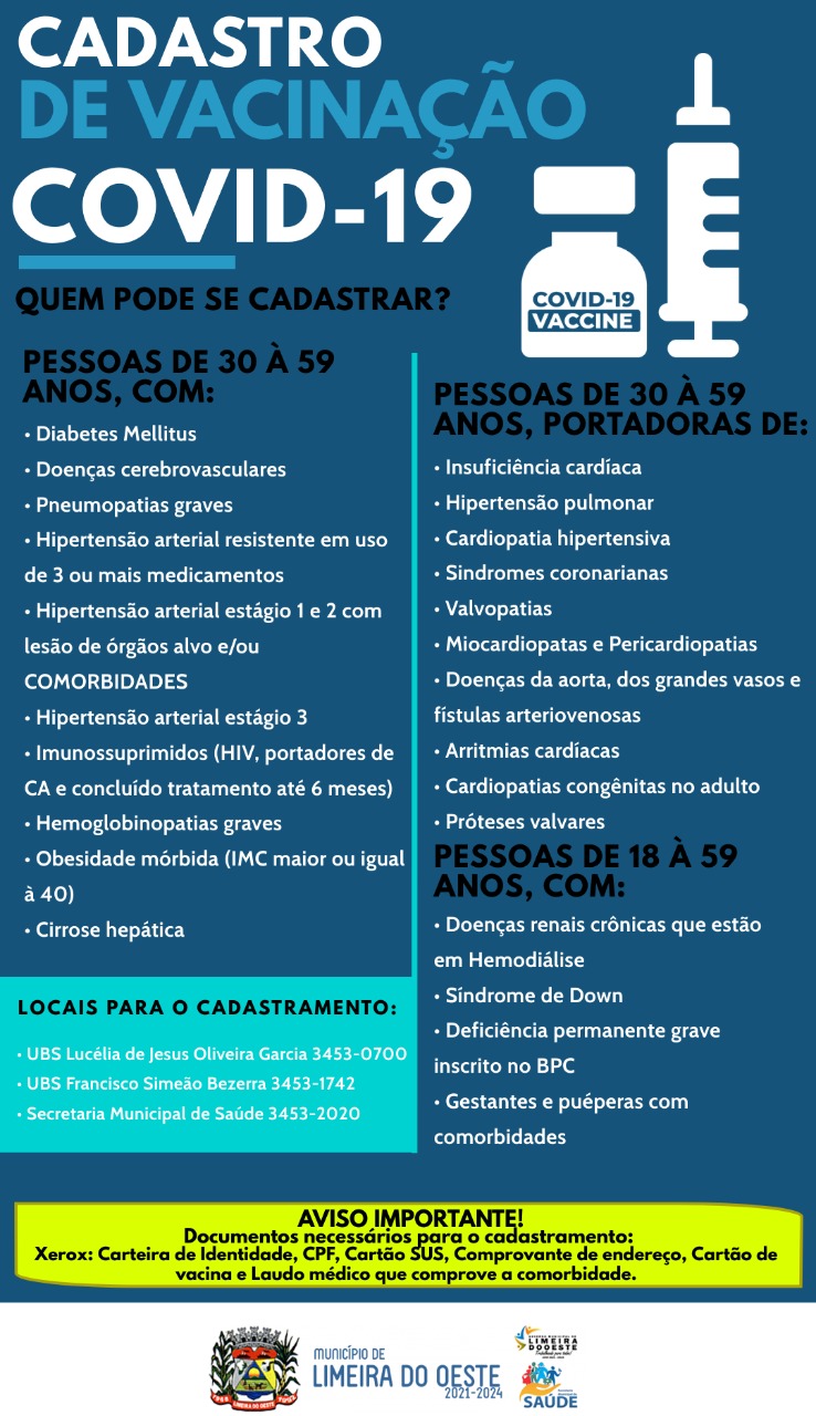 Notícias VACINAÇÃO CONTRA COVID-19 PARA QUEM TEM COMORBIDADES. 9 de junho de 2021 0 Pessoas com comorbidades que ainda não se vacinou, devem procurar as UBSs, Francisco Simeão Bezerra e Lucélia Garcia.